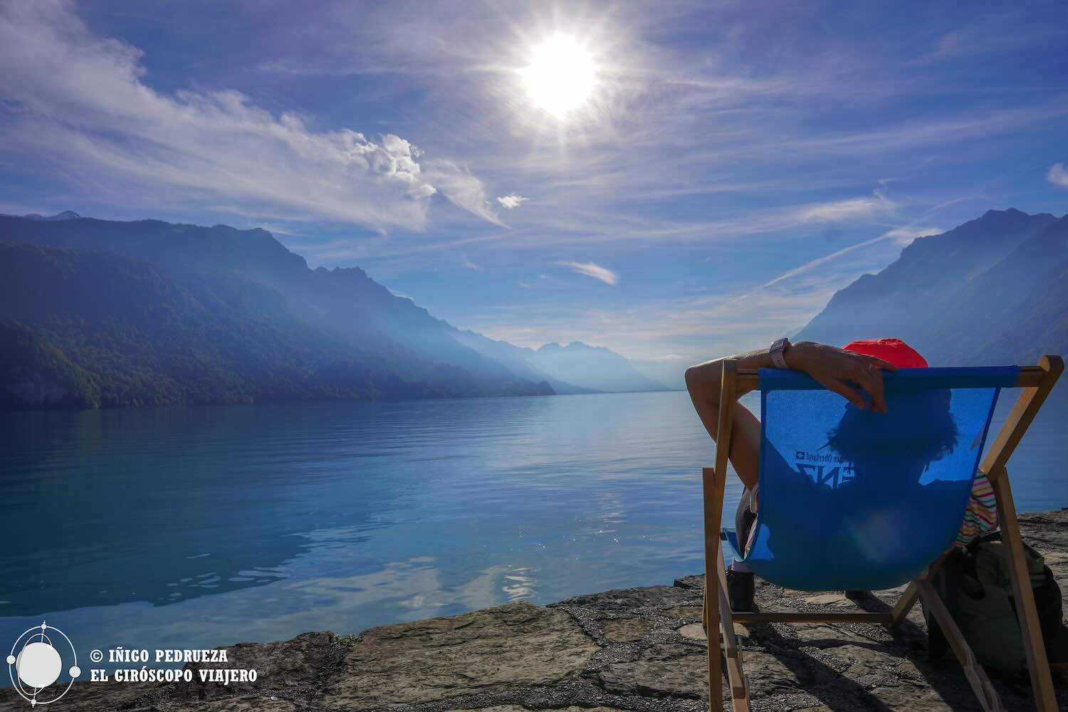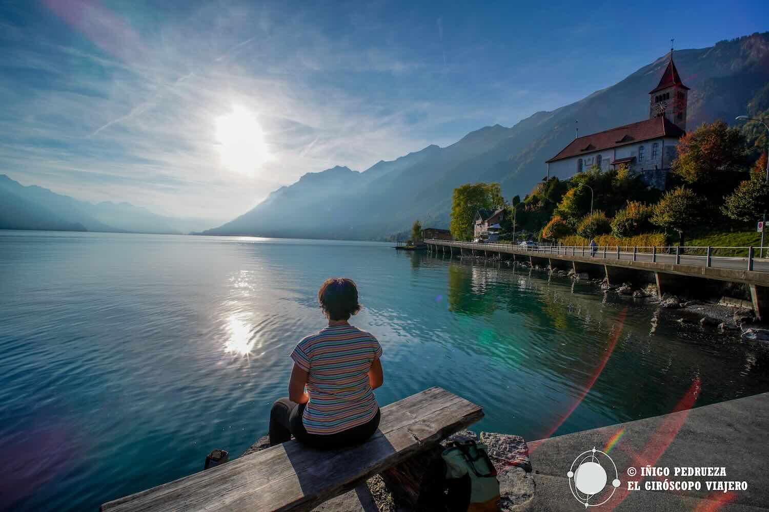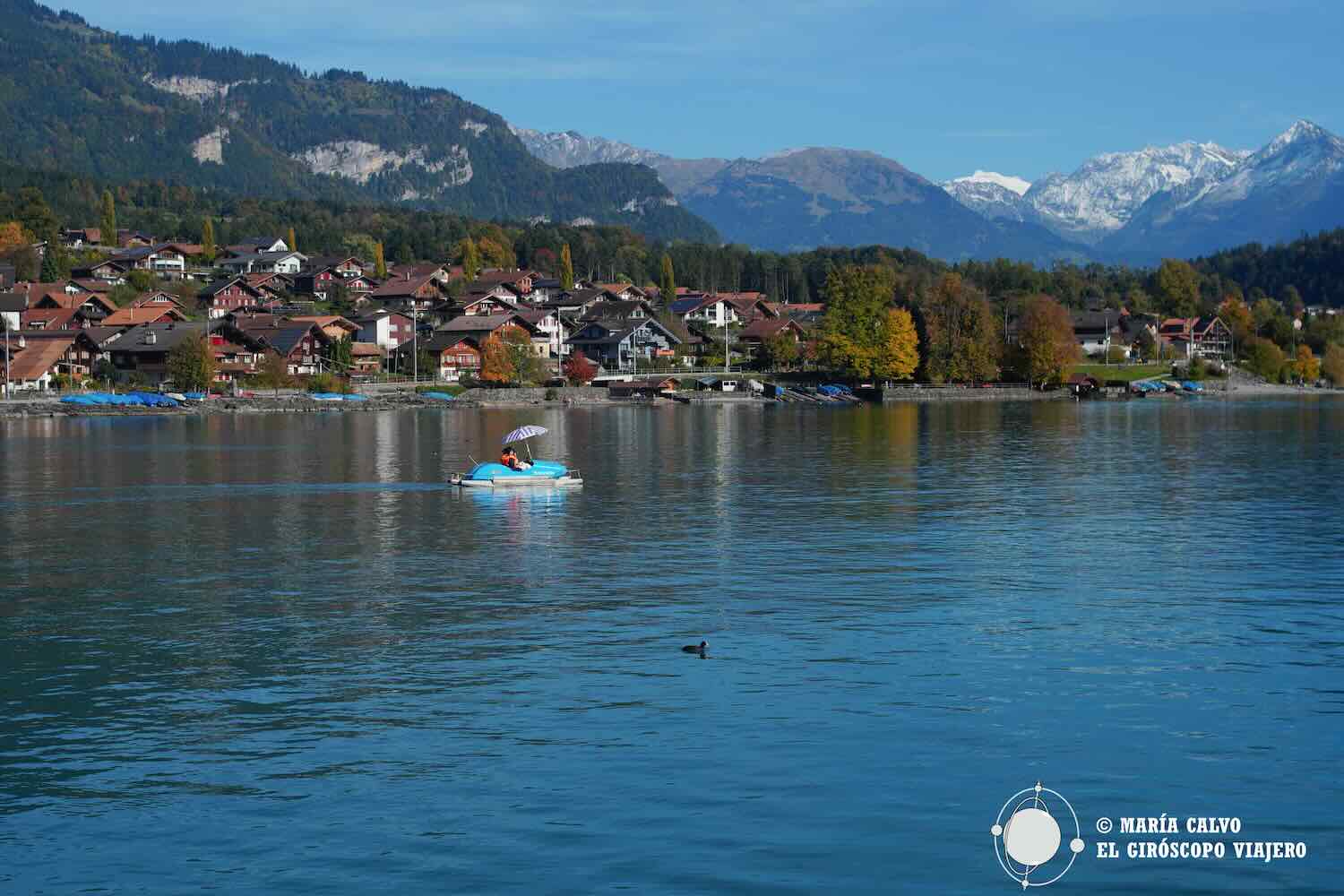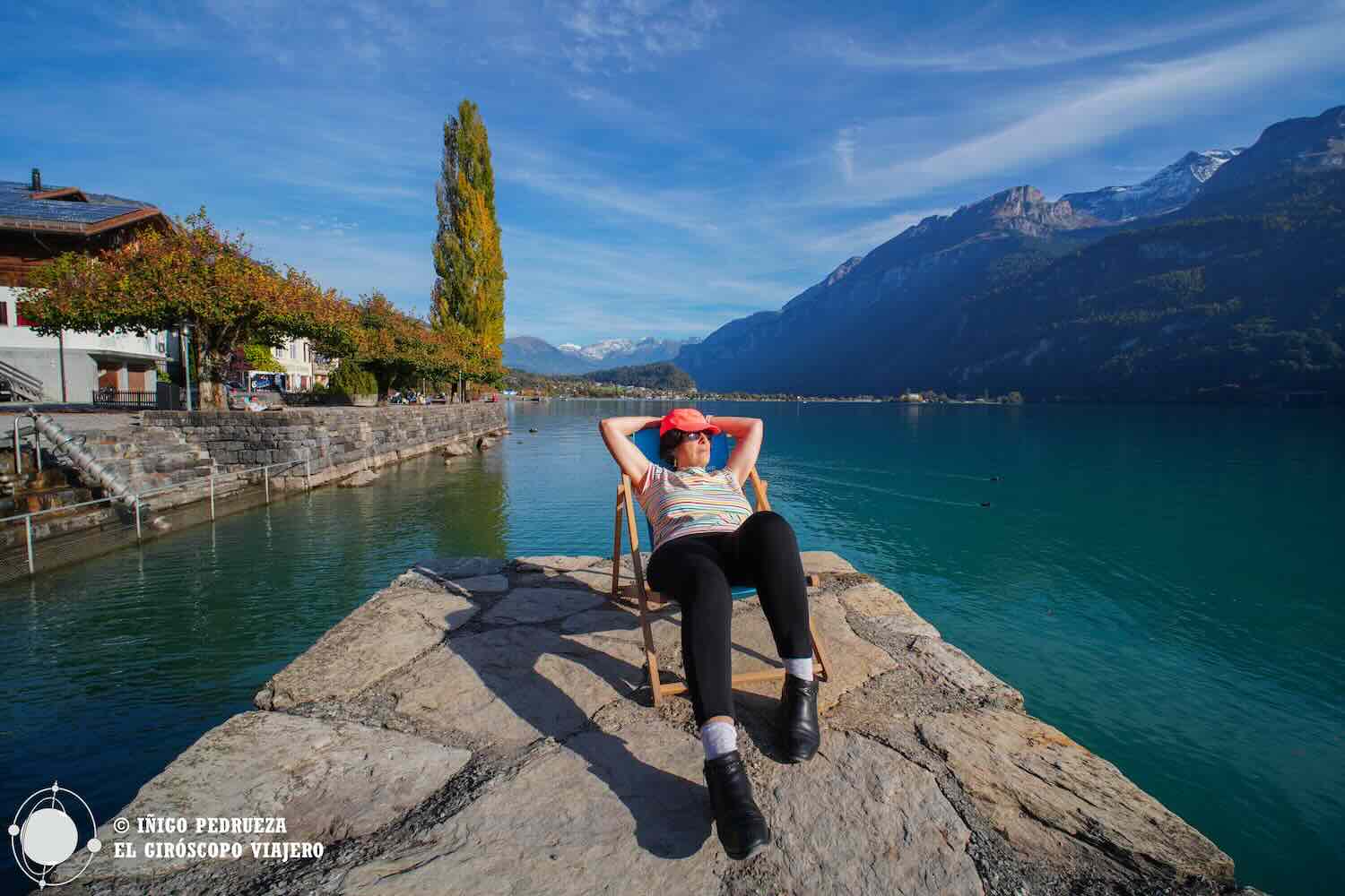 Así que, a mitad del paseo, decidimos imitarlos y nos sentamos a mirar este paisaje otoñal de bosques anaranjados que ascienden hasta las montañas nevadas. Y el Lago Brienz en primer plano, con sus aguas tranquilas que se pierden en el horizonte. Y un silencio placentero interrumpido por momentos por unas aves que nadan plácidamente en estas aguas. Tampoco ellas tienen ganas de irse de aquí.