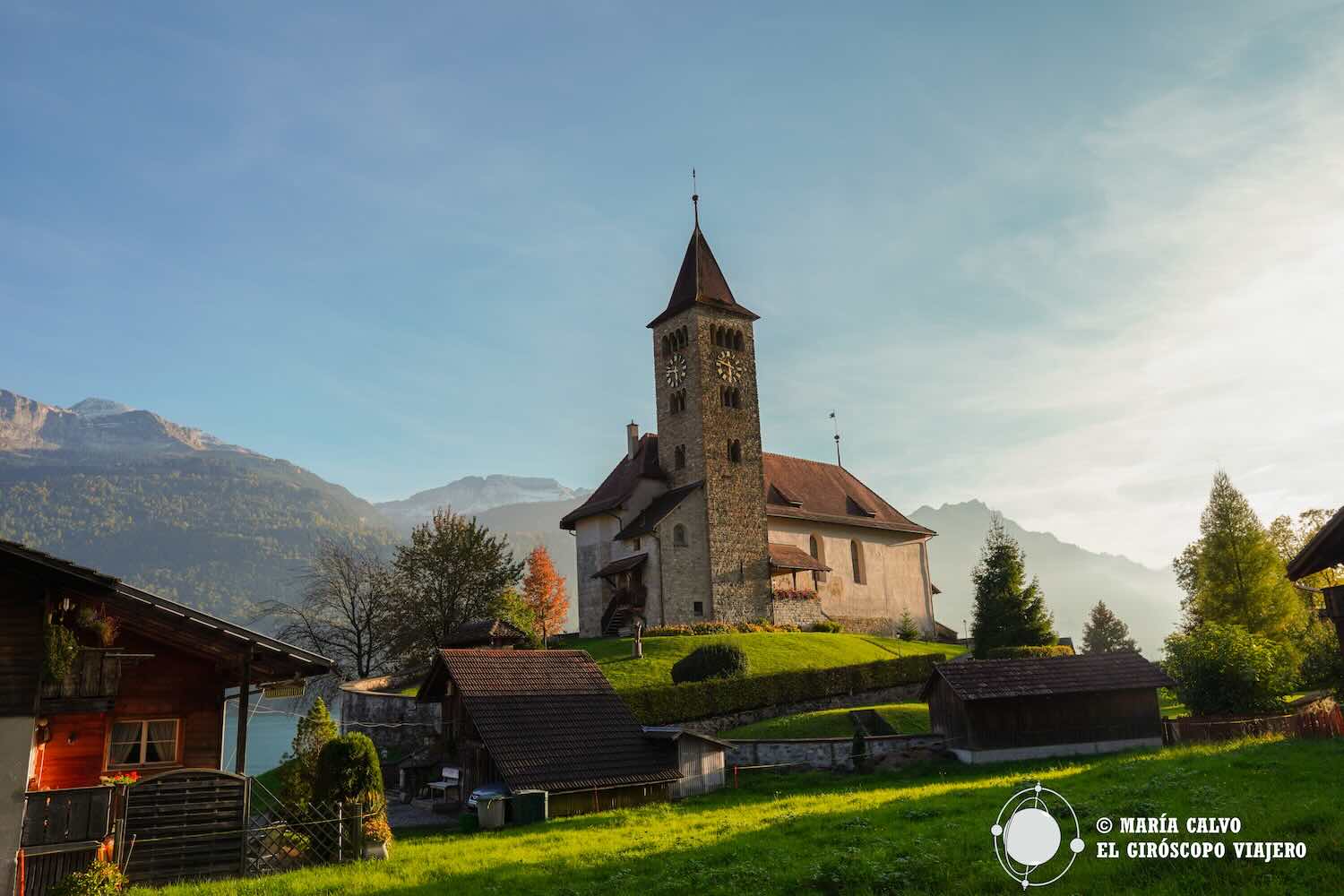 Aquí comienza el largo paseo a orillas del lago Brienz hasta la iglesia. Es principios de octubre, pero el frío todavía no se instaló en la región. Al contrario, en Brienz luce el sol, que hace que resalta los azules de sus aguas. Hemos oído que aquí hay un microclima que permite a los habitantes de este pueblo idílico disfrutar de días luminosos junto al lago.