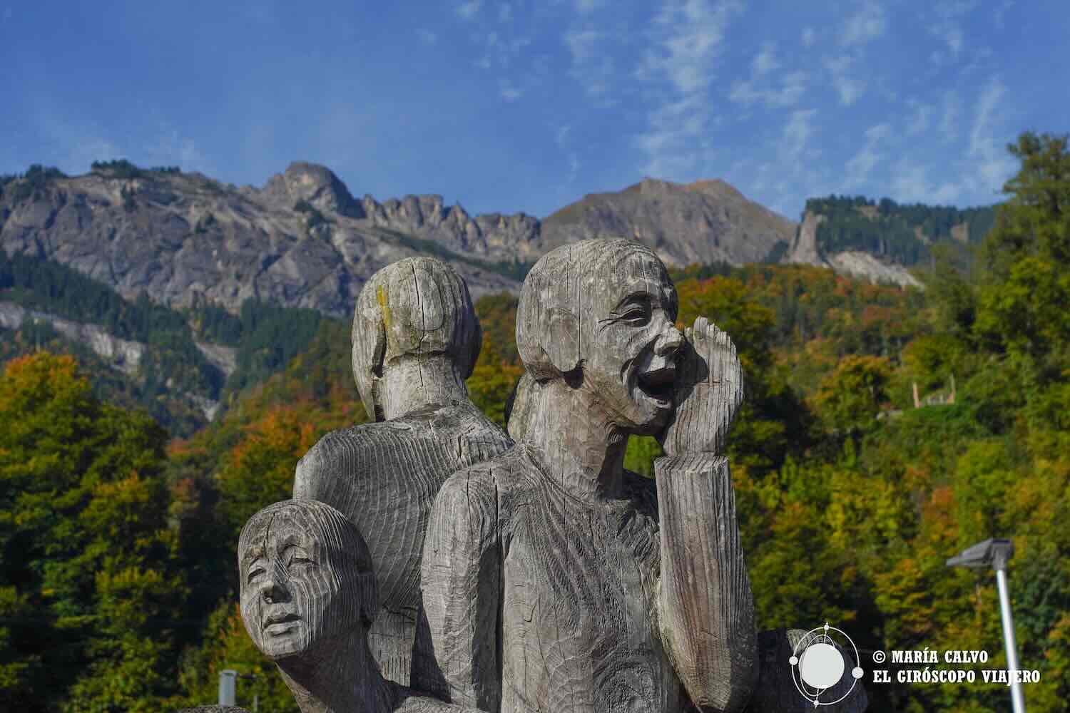 Después volvemos al paseo del lago para seguir caminando, admirar una curiosa escultura de personas que están gritando o jugar a alguno de los juegos que se instalaron para divertimento del visitante. Más adelante, en una zona alta con vistas, está la iglesia de Brienz y se termina el paseo. Nuestra mirada se pierde en el horizonte, entre acantilados envueltos en la calima del atardecer.