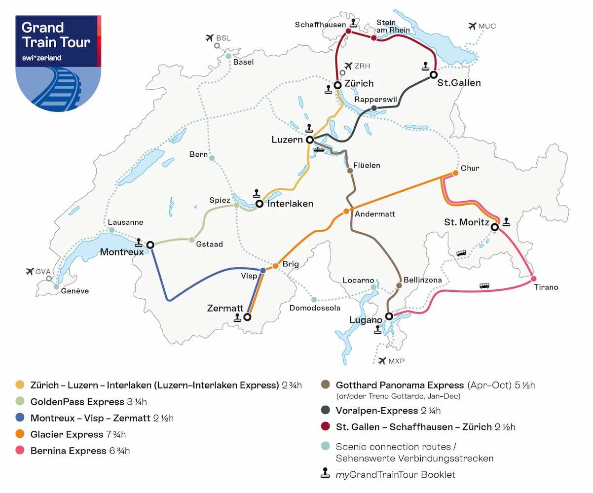 La línea panorámica Luzern-Interlaken Express no es la única que hay en Suiza. De hecho, son cinco las líneas que forman parte del Gran Tour en Tren de Suiza, repartidas por una buena parte del país. Una impresionante ruta que une los recorridos más pintorescos. En total 1280 kilómetros que pasan por algunos de los lugares más bellos d Elos Alpes, 11 grandes lagos, 5 Sitios Patrimonio de la Humanidad de la Unesco y algunas de las ciudades más bonitas de Suiza. Estas son las rutas que, a su vez, se unen con otras conexiones panorámicas.