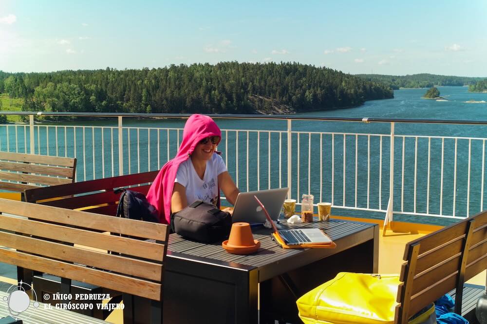 Las vistas desde la escotilla permitían ver la capital sueca y, después, el reguero de islas que se esparcen entre Suecia y Finlandia casi ininterrumpidamente. Pero no nos quedamos en el camarote. Una vez instalados, dejamos las maletas, comprobamos que el wifi era accesible (siempre gratis y abierto en las partes comunes del ferry y, dependiendo de la situación de nuestra cabina, también se cogía en el mismo camarote), nos abrigamos un poco y salimos a la cubierta superior. Como viajábamos a finales de septiembre y el tiempo en Estocolmo no había sido clemente, nos protegimos, porque el mar siempre es más fresco.