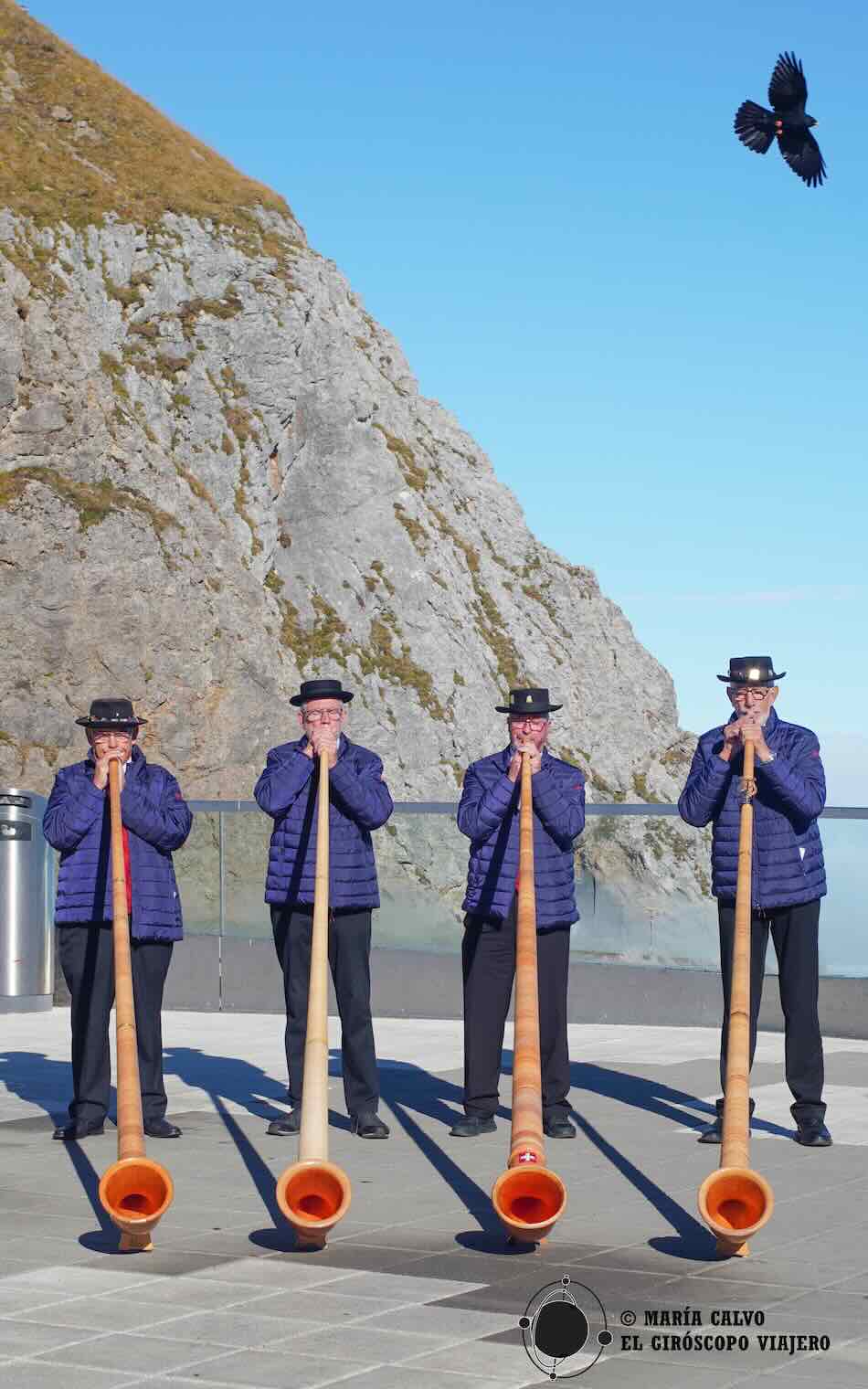 Hasta los cuernos alpinos -enormes trompetas hechas de madera- suenan magníficamente en el Pilatus en un concierto improvisado que dan unos músicos vestidos con el atuendo típico. Un instrumento impresionante de 3,5 metros que en el pasado servía para llamar a las vacas que pastaban en altitud y que hoy tocan más de 1800 músicos en Suiza. Es todo un símbolo del país.