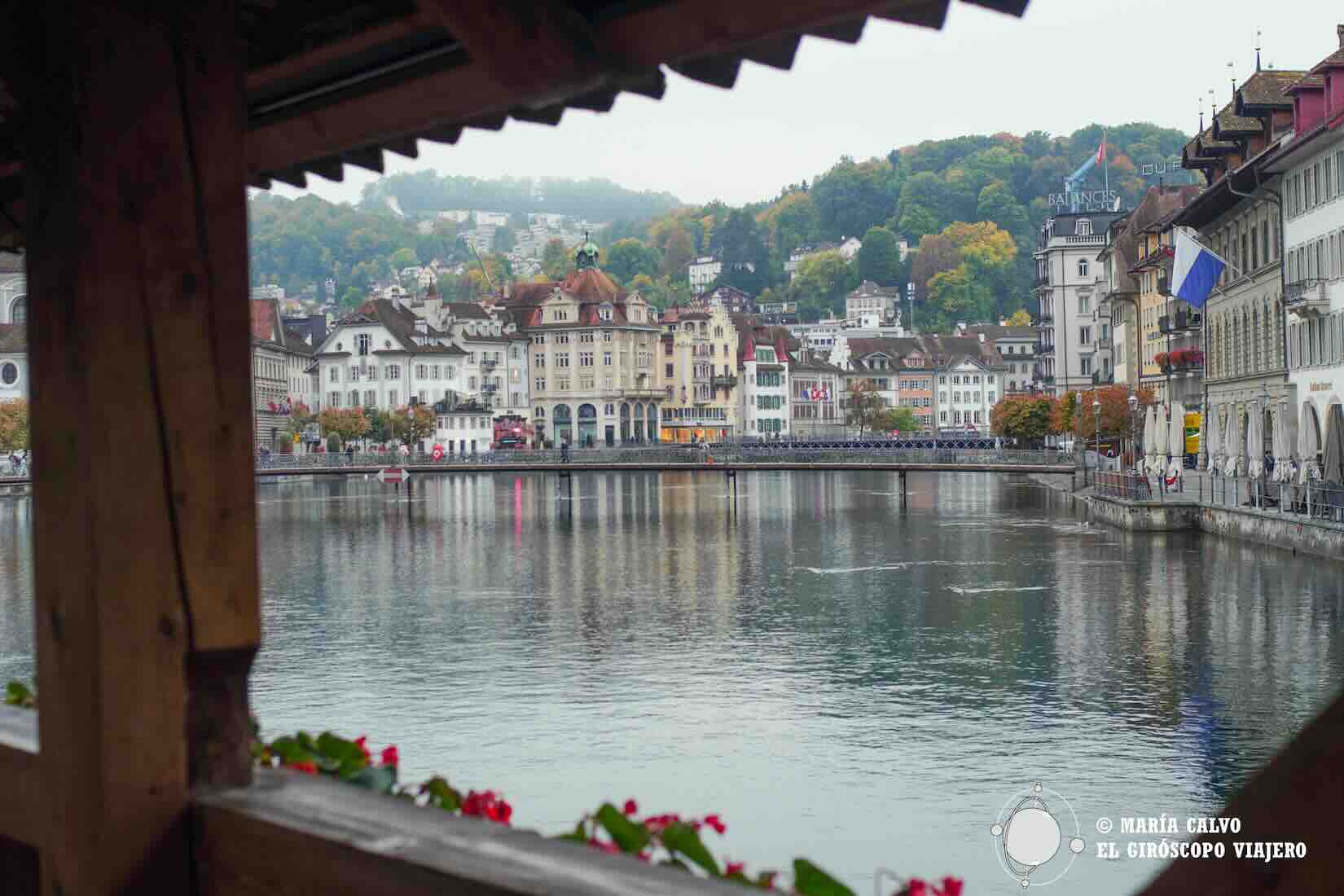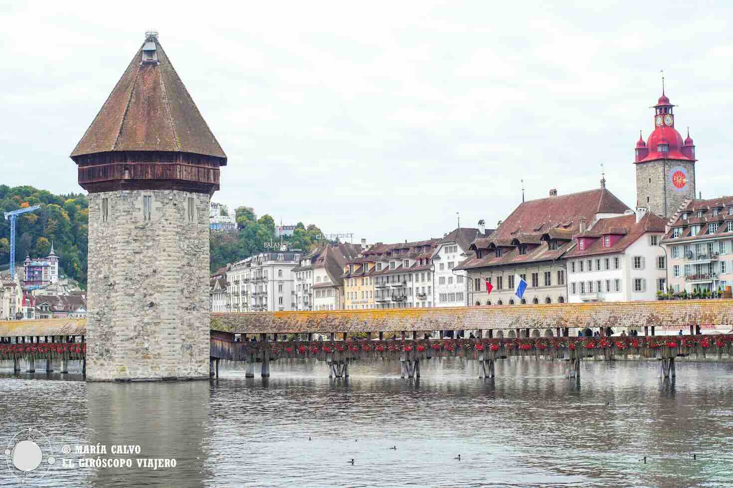 Aunque la principal atracción de Lucerna la encontramos poco después: el célebre Puente de la Capilla, el “Kapellbrücke”, símbolo de la ciudad. Una maravilla de la arquitectura en madera del siglo XIV, el puente cubierto más antiguo de Europa atraviesa en zigzag el río Reuss, conectando el centro histórico con la ciudad nueva.