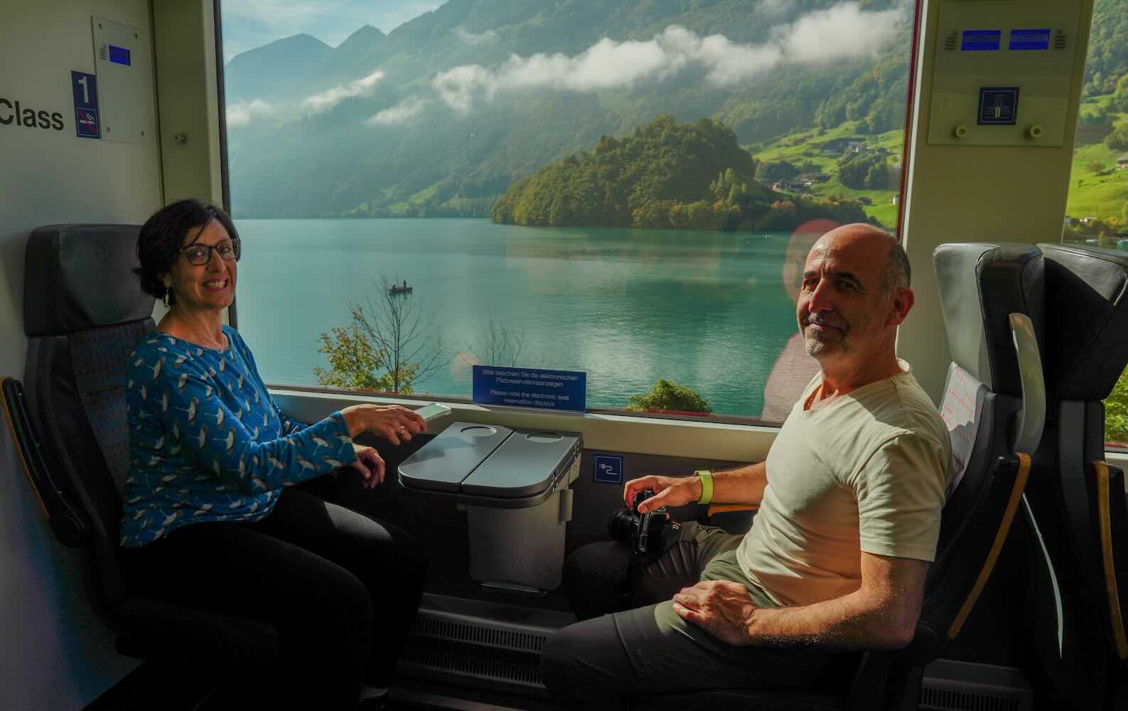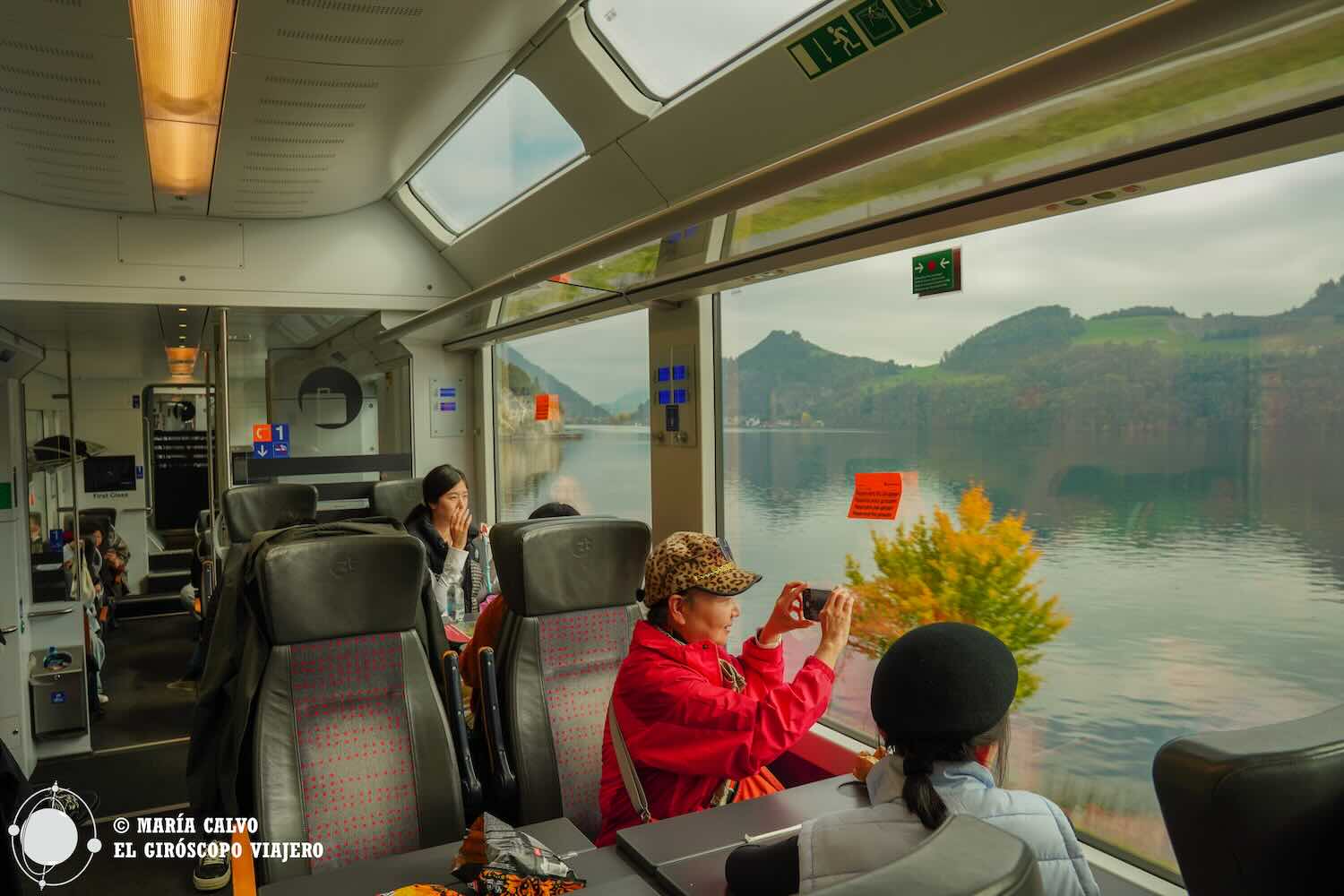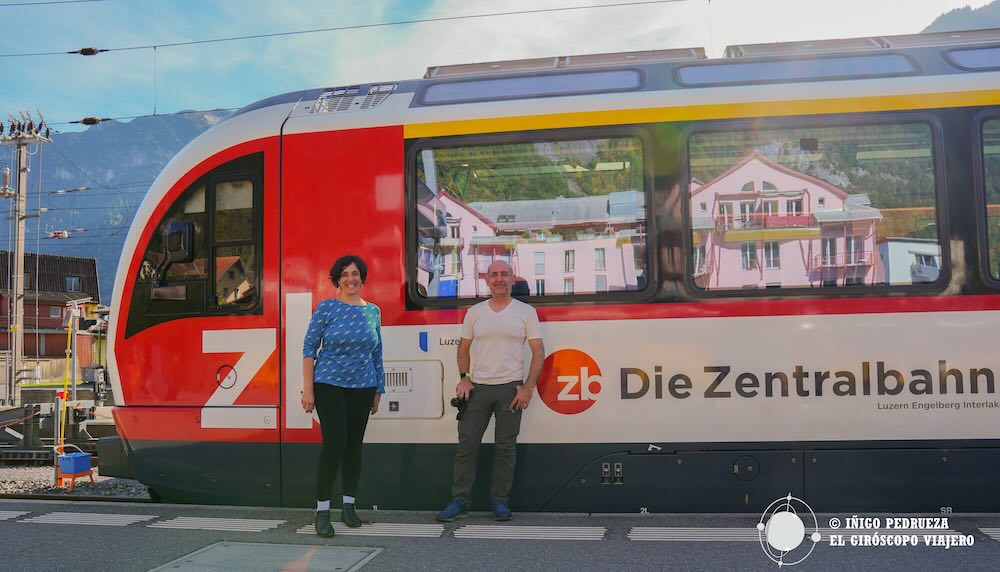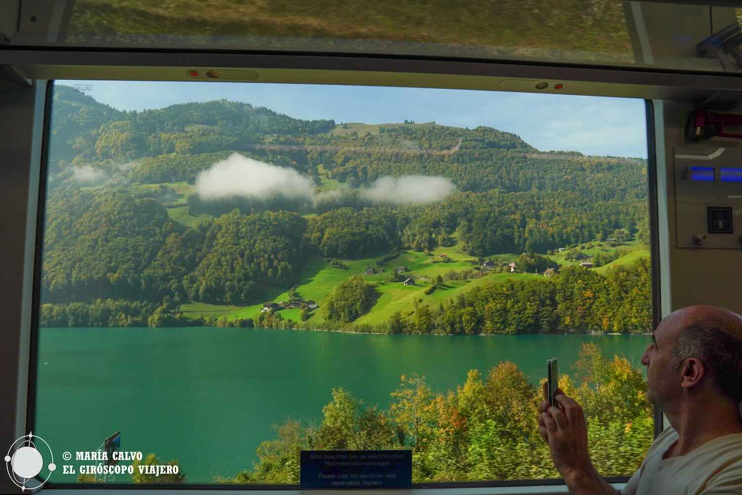 El nuestro fue fascinante viaje de 1h50 en un tren panorámico que pasa a orillas de cinco lagos: Cuatro Cantones, Alpnach, Sarnen, Lungern y Brienz. Se suceden imágenes de un paisaje de prados, montañas y pueblos idílicos.