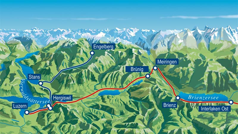 El primero Sarnen, entre bosques y prados, rodeado de escarpadas cordilleras. Después, Brünig-Hasliberg, el punto culminante de la ruta (1001m.), que nos ofrece un panorama impresionante de los Alpes berneses y sus cascadas. Siguiente parada: Brienz, un pueblo típico suizo de chalets situado en un enclave privilegiado entre montañas y a orillas de un lago. Y la última estación: Interlaken, entre los lagos Brienz y Thun, con vistas panorámicas de las montañas Eiger, Mönch y Jungfrau.