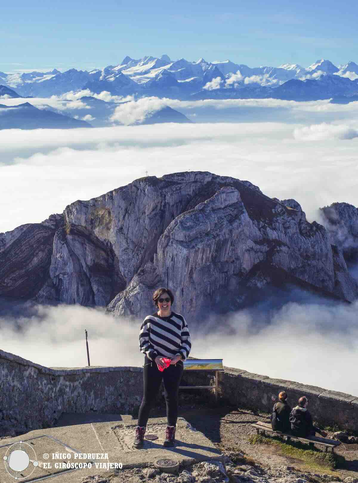 La sorpresa del mar de nubes cubriéndolo todo, -del que sobresalen los picos nevados de los Alpes-, nos hace olvidar que hoy no veremos las panorámicas de Lucerna y su lago. Impresiona el silencio y la belleza del panorama, aún más espectacular desde el mirador de Esel, al que se accede por unas escaleras.